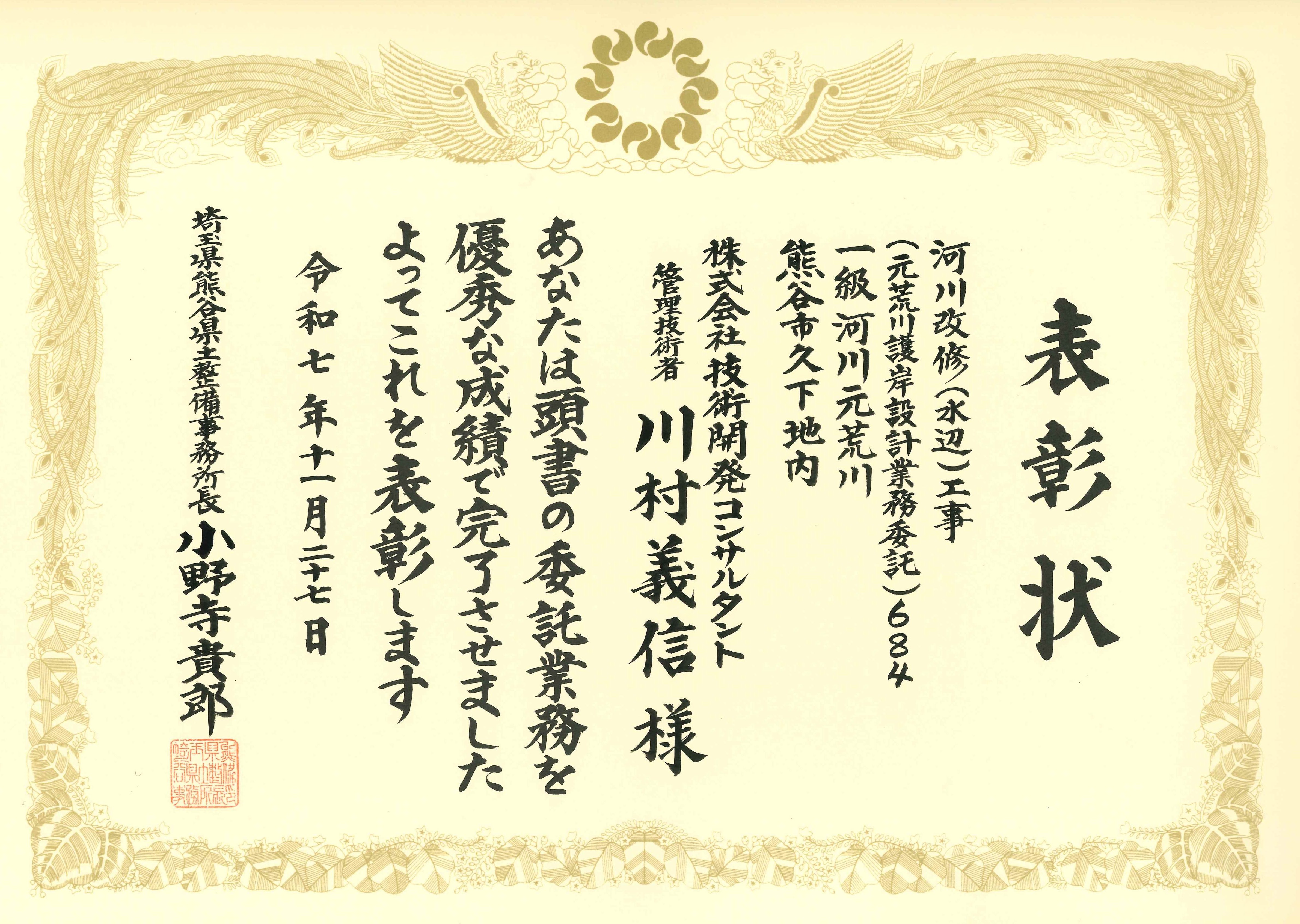 令和7年度埼玉県県土づくり優秀委託業務(課所長)表彰において、 熊谷県土整備事務所より表彰をいただきました。